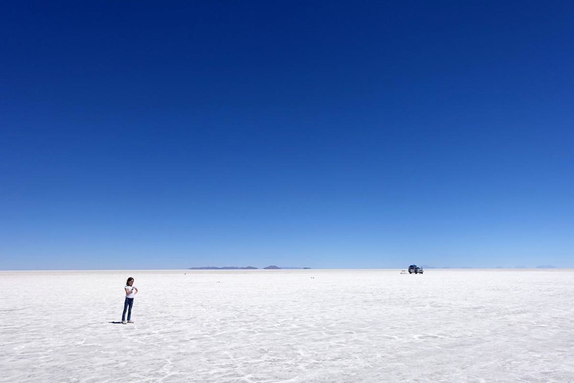 Le vrai voyage commence lorsque nous entrons dans le salar, le plus grand et le plus haut désert de sel au monde. 10 milliards de tonnes de sel. 12 000 km2 de sel à 3 650m d’altitude, laissées là lorsque le lac préhistorique Minchin s’est évaporé. Tout ce blanc aveuglant, cette surface blême à perte de vue, absolument vierge, sur laquelle les 4X4 semblent glisser est stupéfiant. La couche de sel peut atteindre 40 mètres, elle se forme en un immense motif aux formes hexagonales extraordinaire, et en dessous, on trouve de l’eau saumurée, véritable lac souterrain.